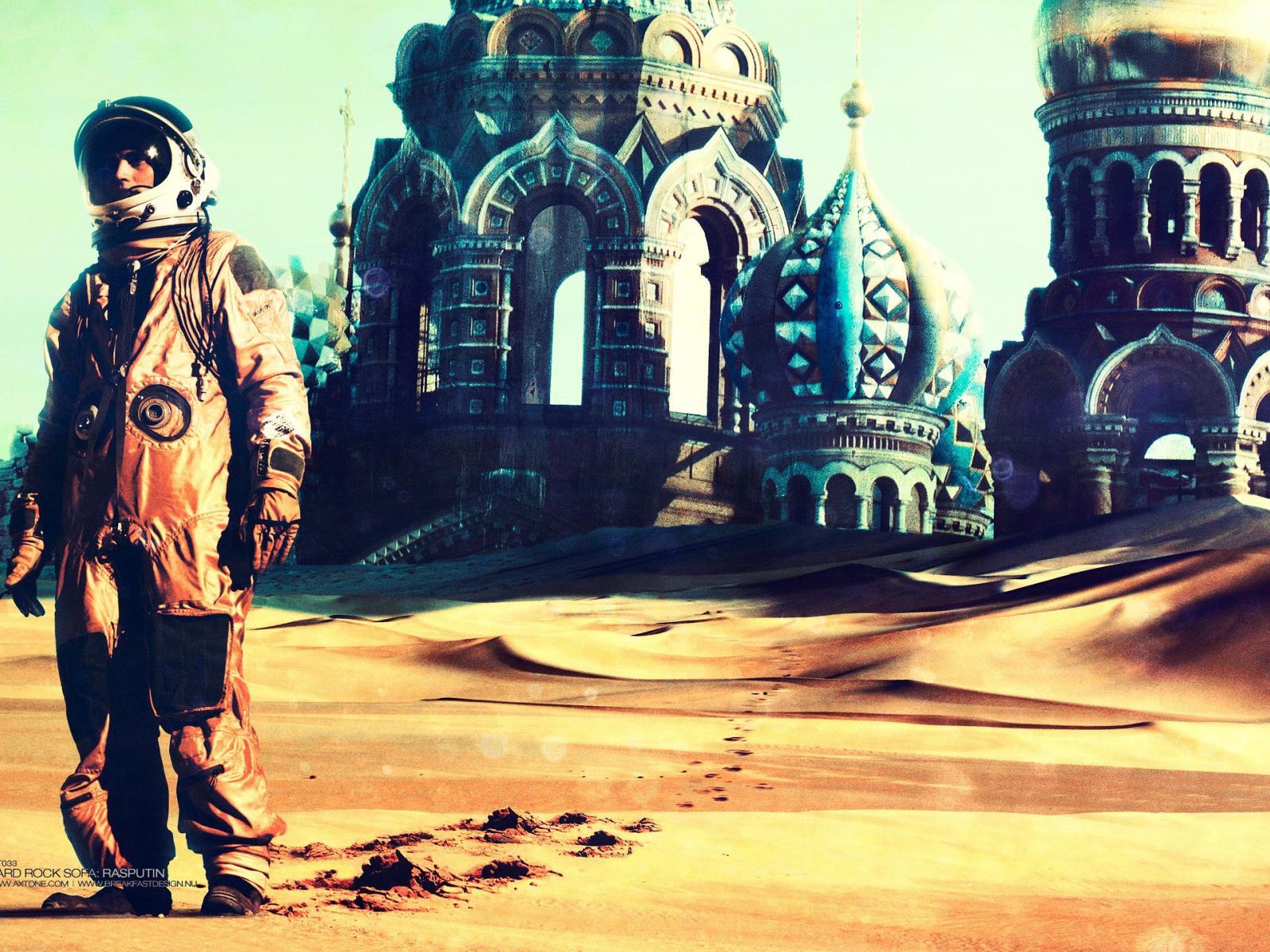 Wallpaper Cosmonaut in an abandoned church in the desert