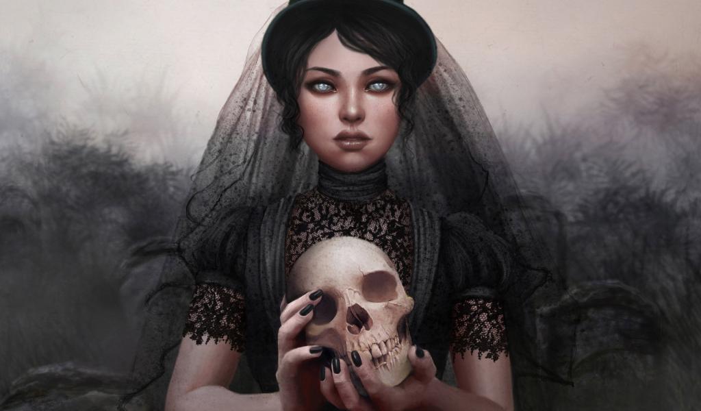 Wallpaper She is in mourning with a skull in his hands