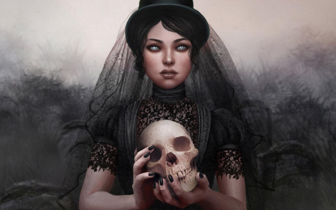 Wallpaper She is in mourning with a skull in his hands