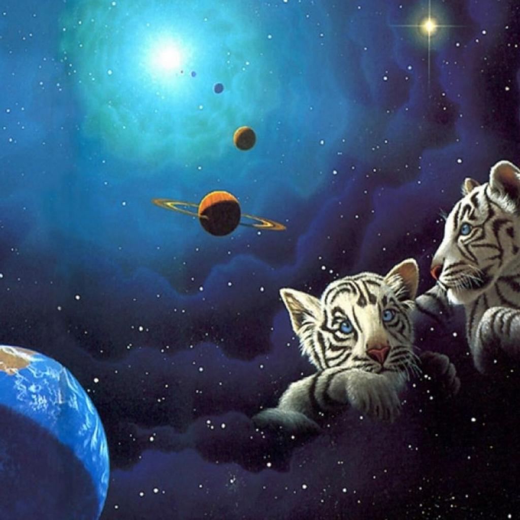 Wallpaper Two white tiger cub in space