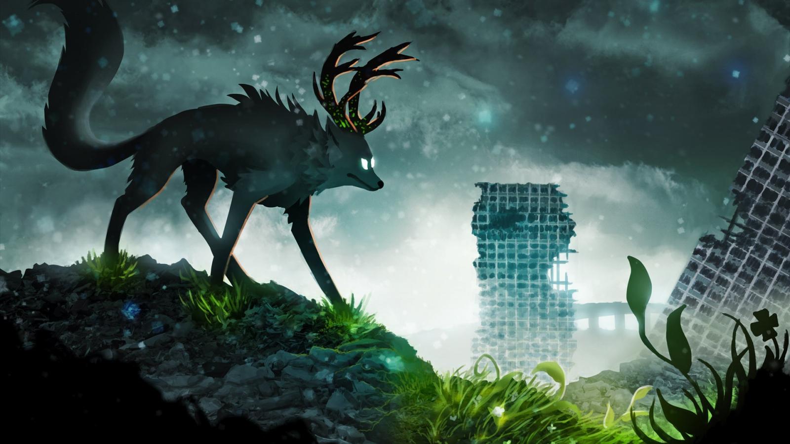 Wallpaper Horned wolf in the world of the future