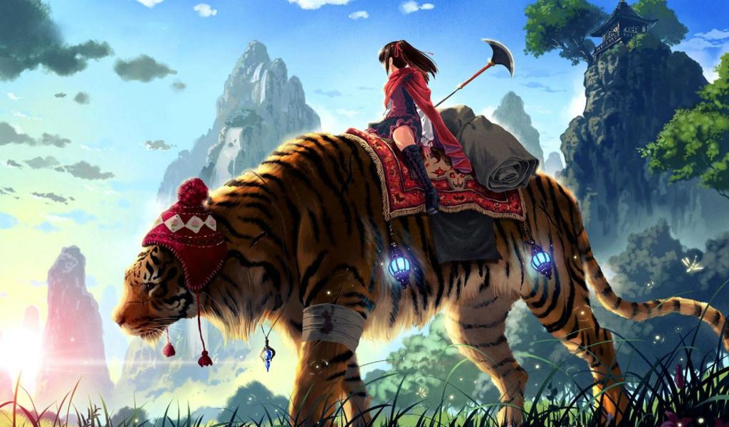 Wallpaper Girl riding a tiger fighting