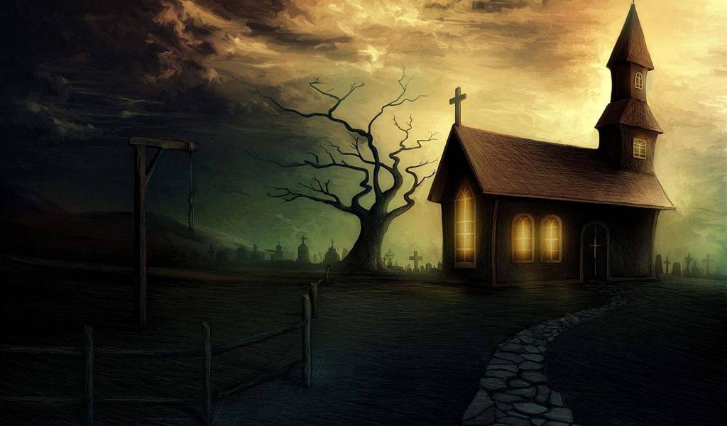 Wallpaper The light in the windows of churches and the gallows in front of her