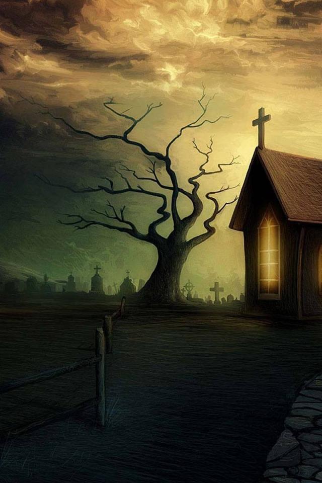 Wallpaper The light in the windows of churches and the gallows in front of her