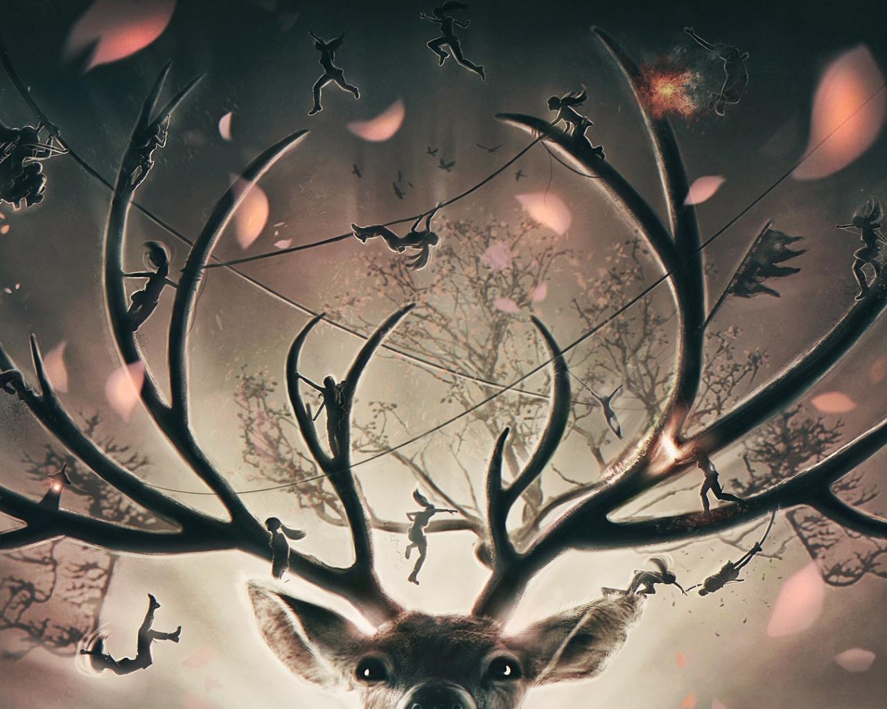 Wallpaper Fairies playing on the horns of a deer