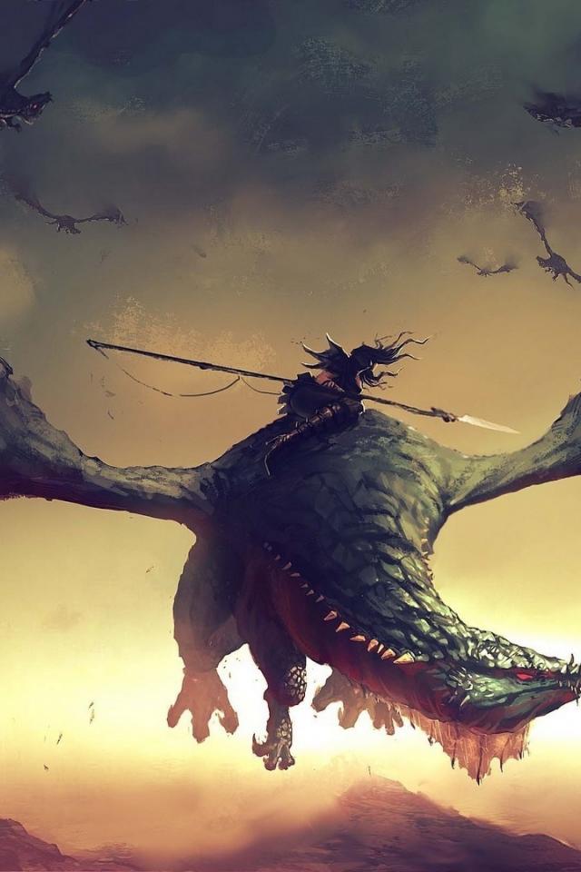 Wallpaper Warrior with a spear on a dragon