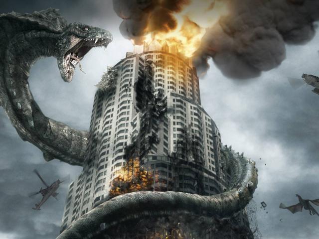Wallpaper Dragon wrapped burning building