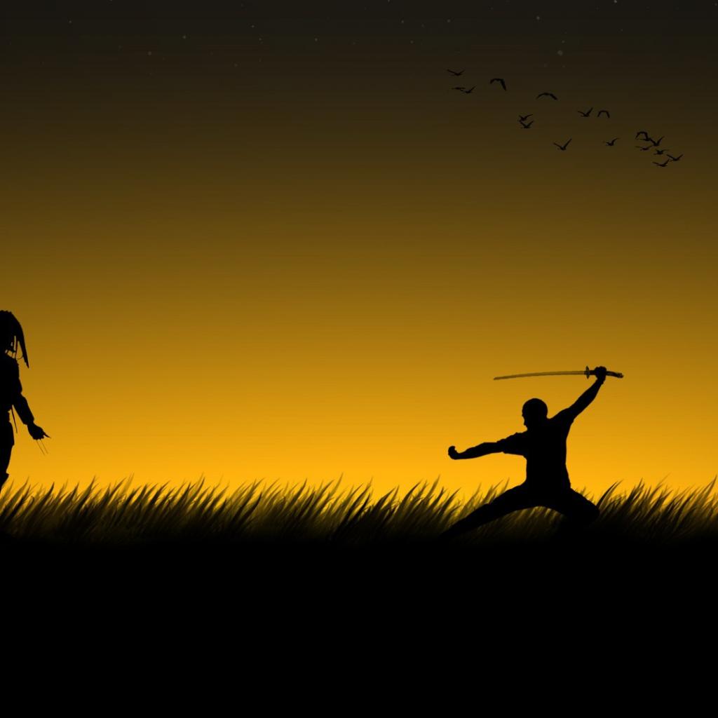 Wallpaper Predator and Alien in a field at sunset