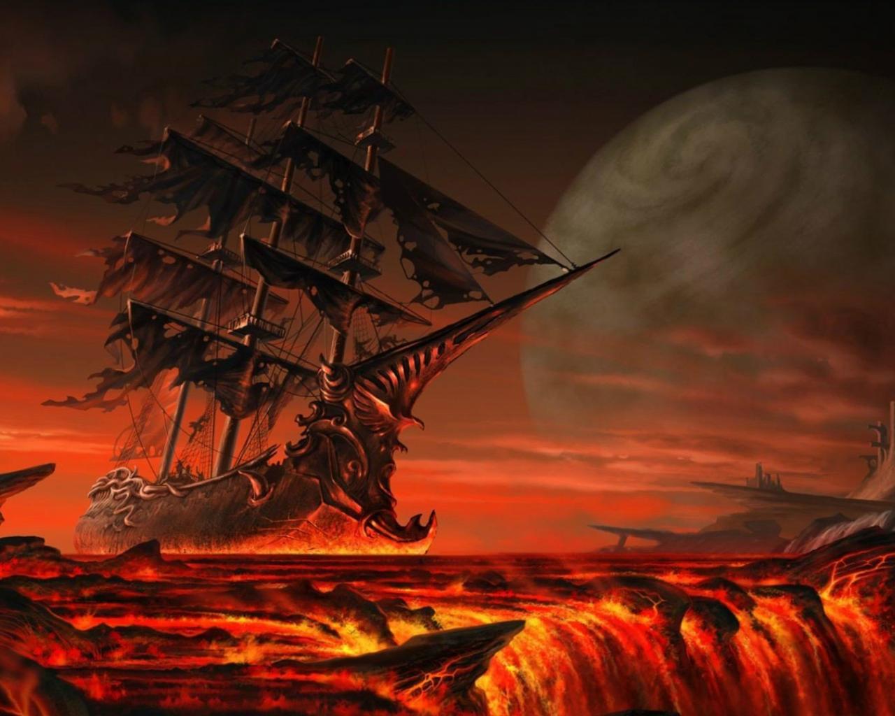 Wallpaper Ghost ship in a fiery sea