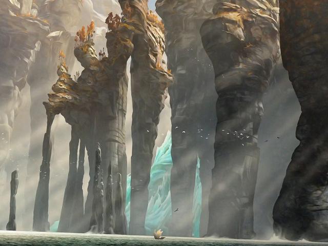 Wallpaper Boat at the foot of the stone pillars