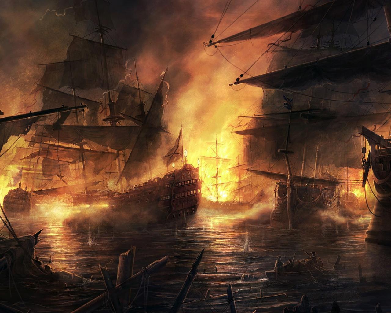 Wallpaper Ships in smoke and fire