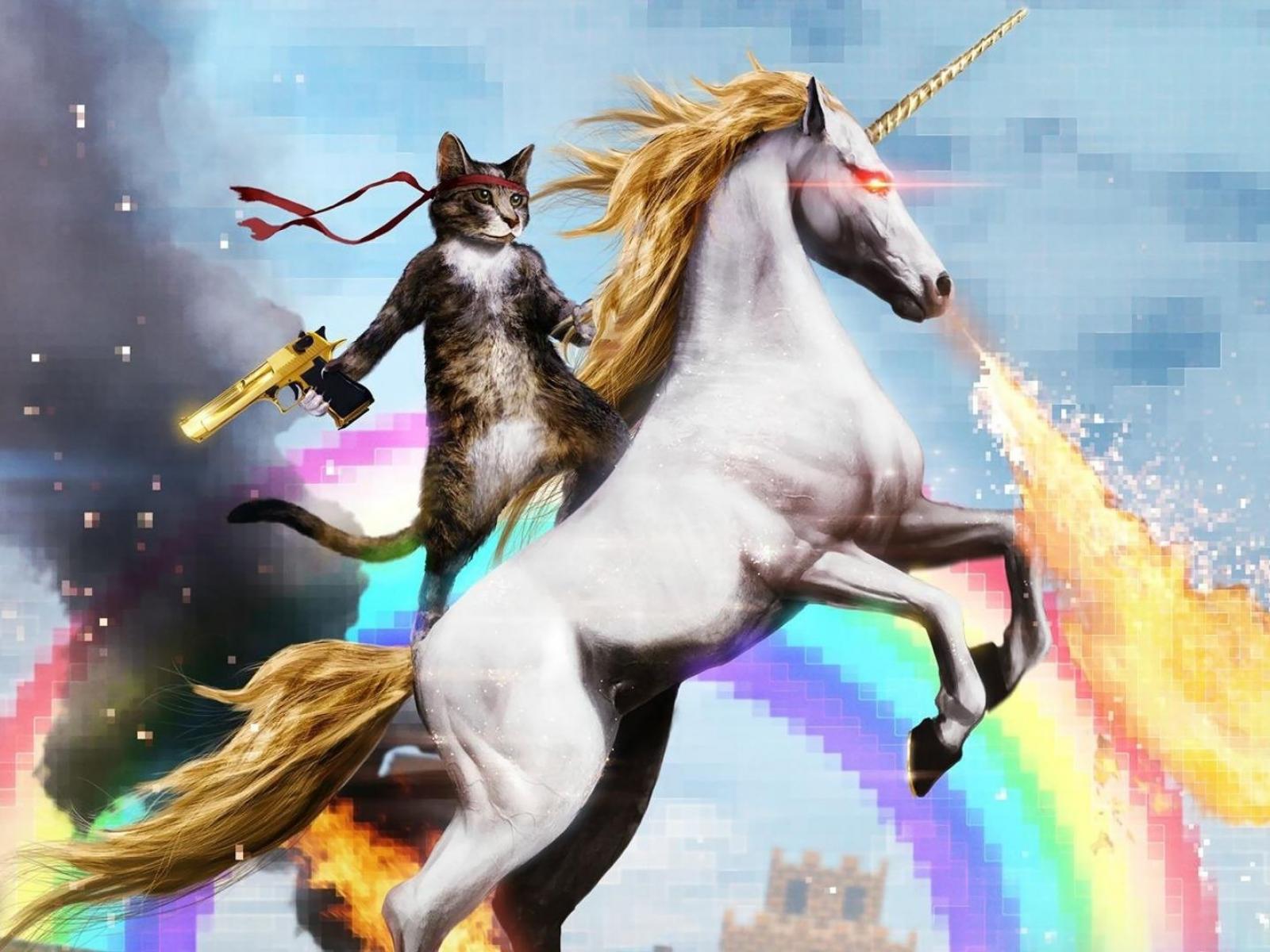 Wallpaper Cat with gun mounted on a unicorn
