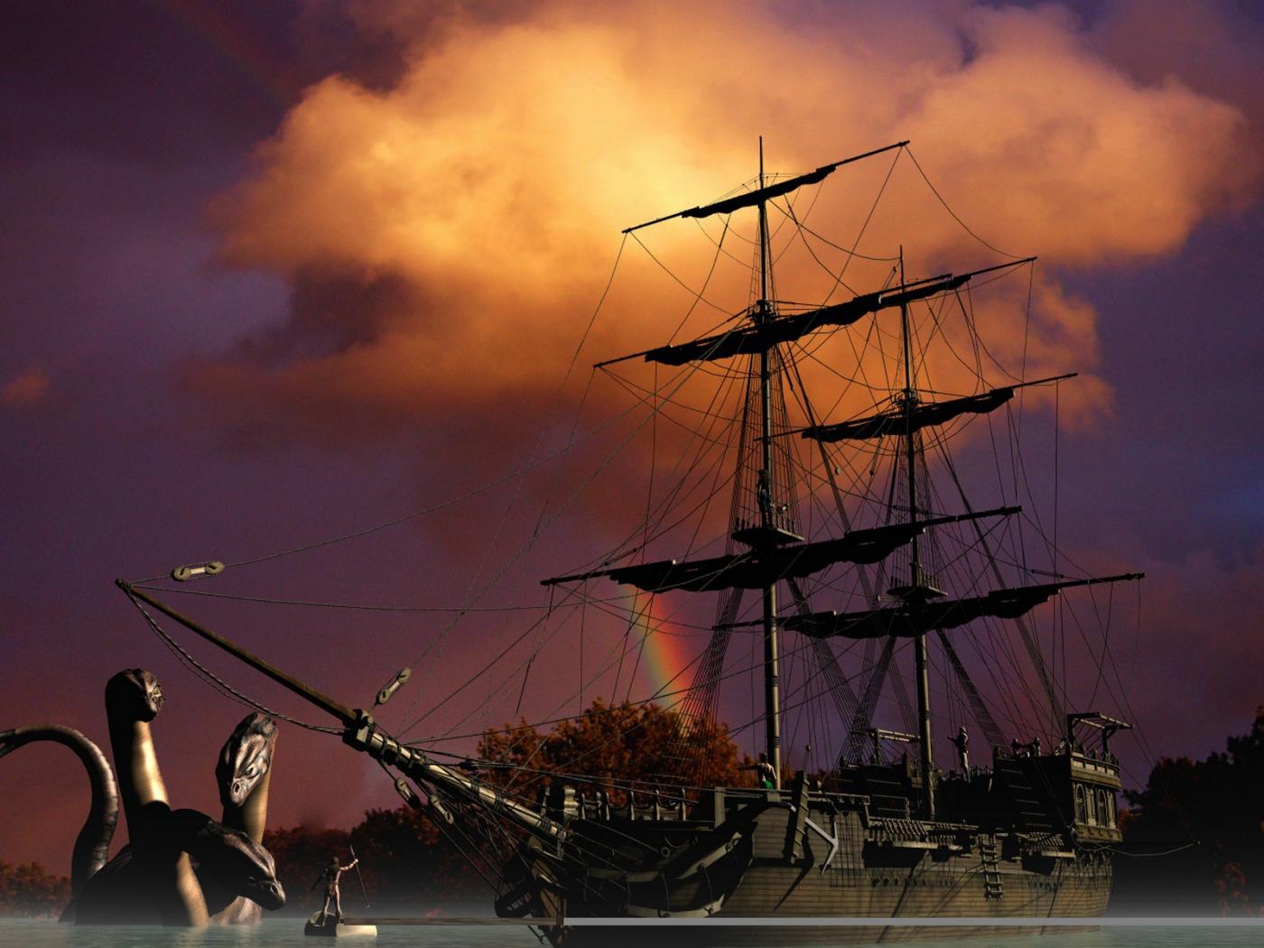 Wallpaper The ship and sea snakes