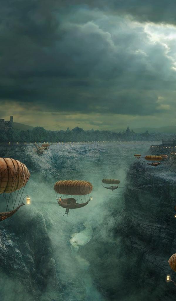 Wallpaper Flying airships over shoaled river