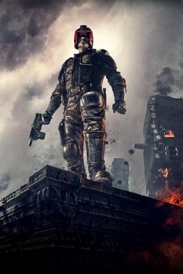 Wallpaper Judge Dredd against the backdrop of a flaming city