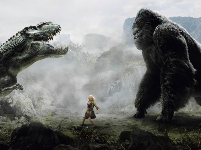 Wallpaper Girl between dinosaurs and gigantic gorilla