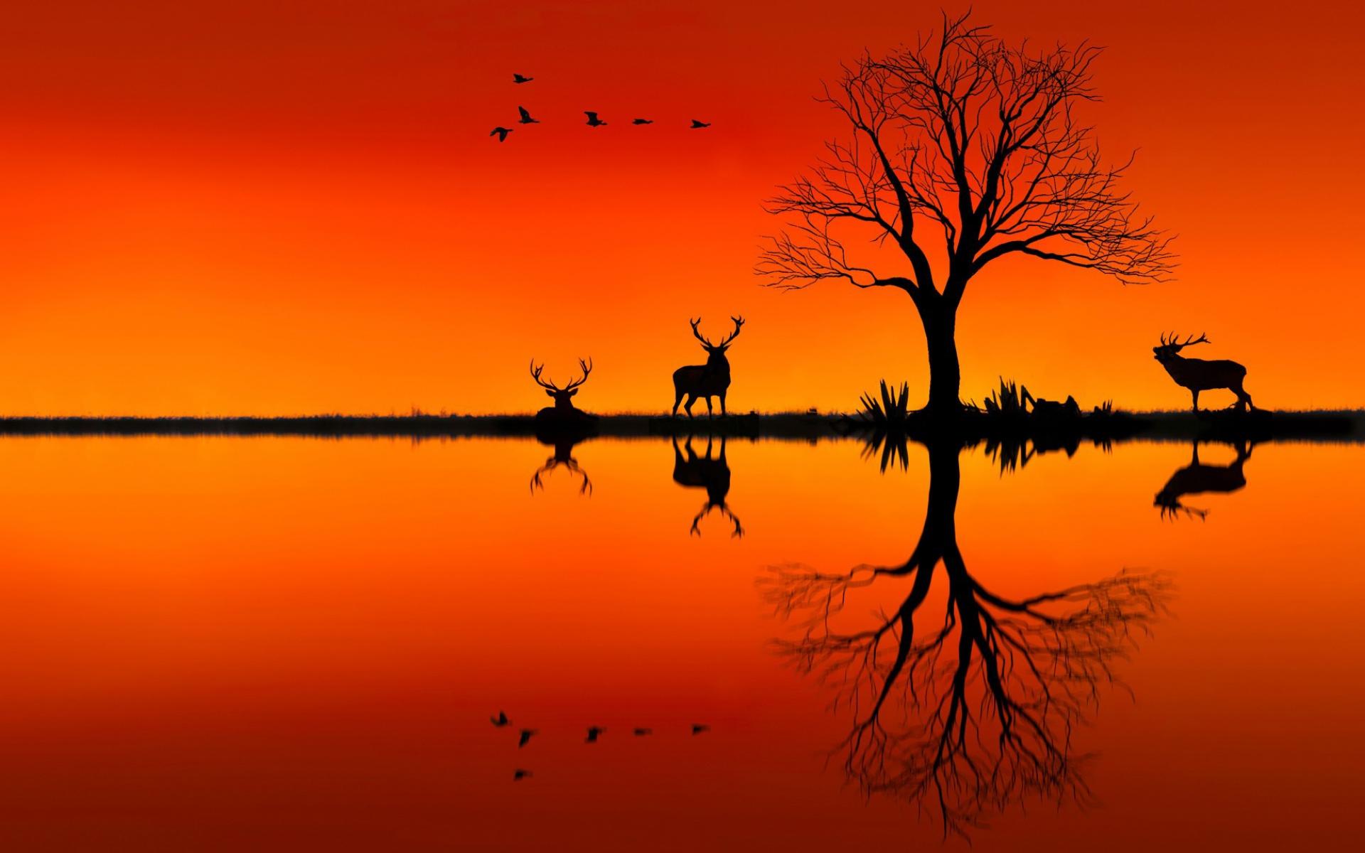 Wallpaper Silhouettes of deer on an orange background