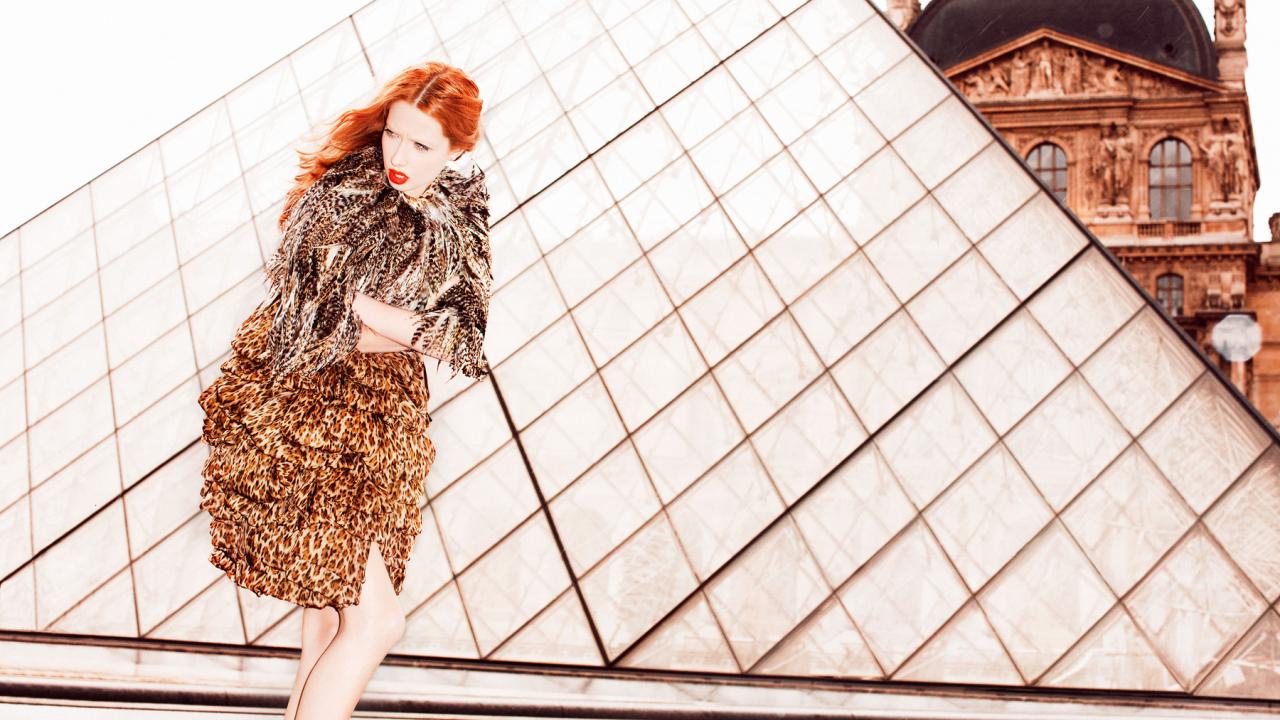 Wallpaper Photo girls on the background of the Louvre pyramid