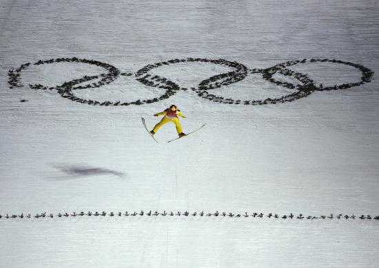 Wallpaper Athlete on the background of the Olympic rings on the Olympic Games in Sochi