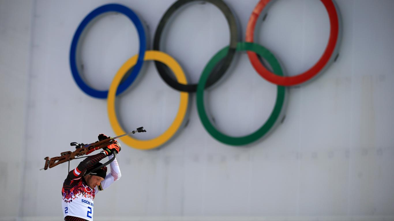 Wallpaper Biathlete on the background of the rings on the Olympic Games in Sochi