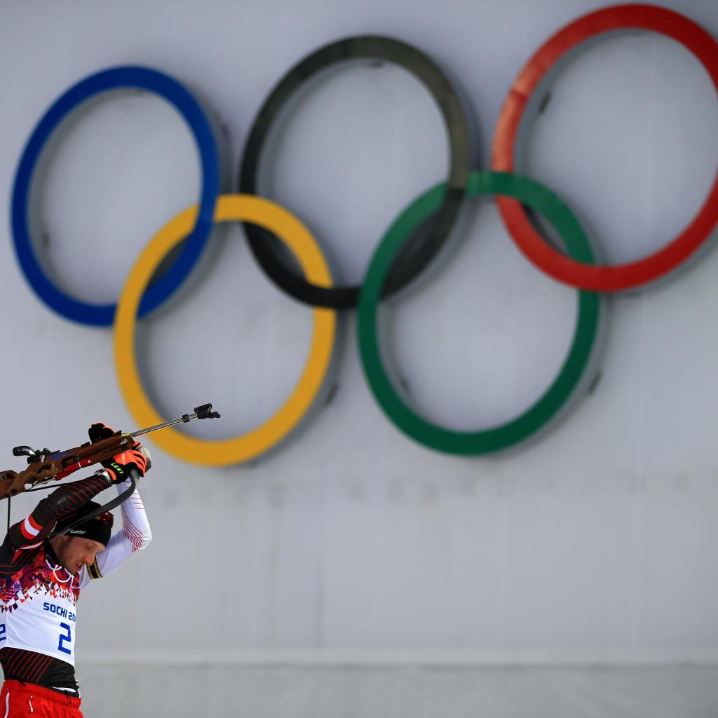 Wallpaper Biathlete on the background of the rings on the Olympic Games in Sochi