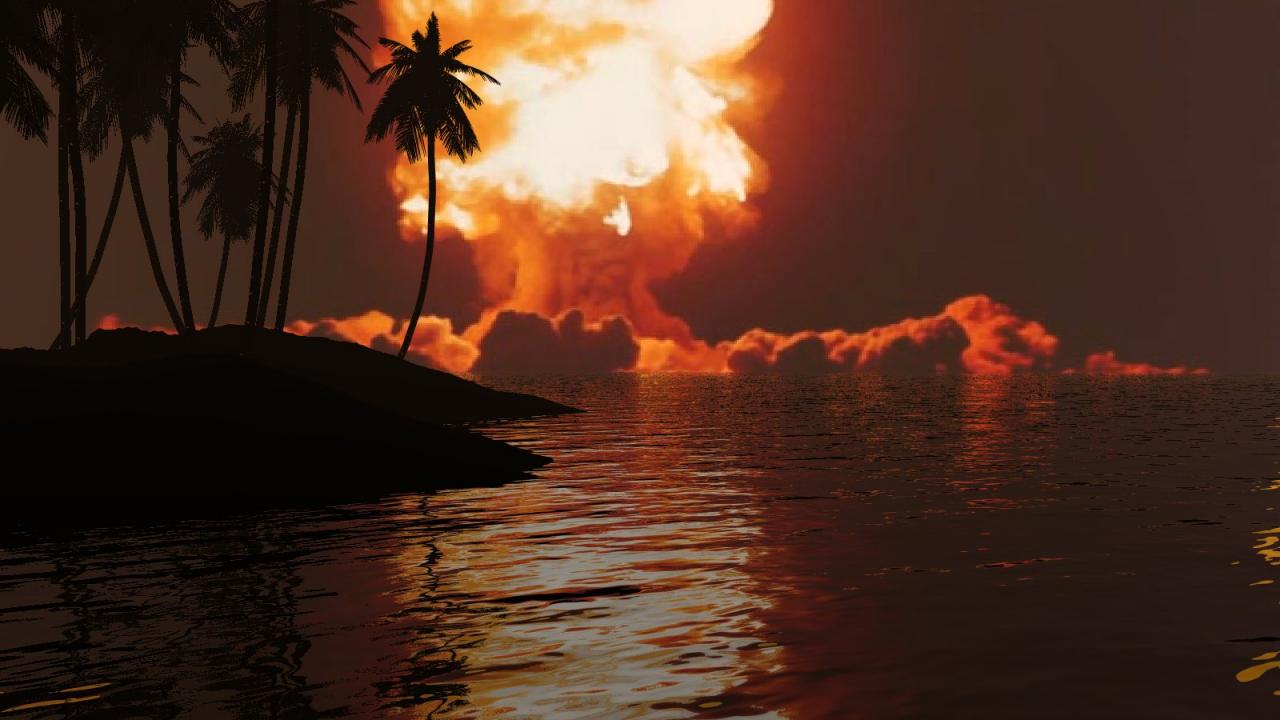 Wallpaper A man looks at a nuclear blast sitting on the bench