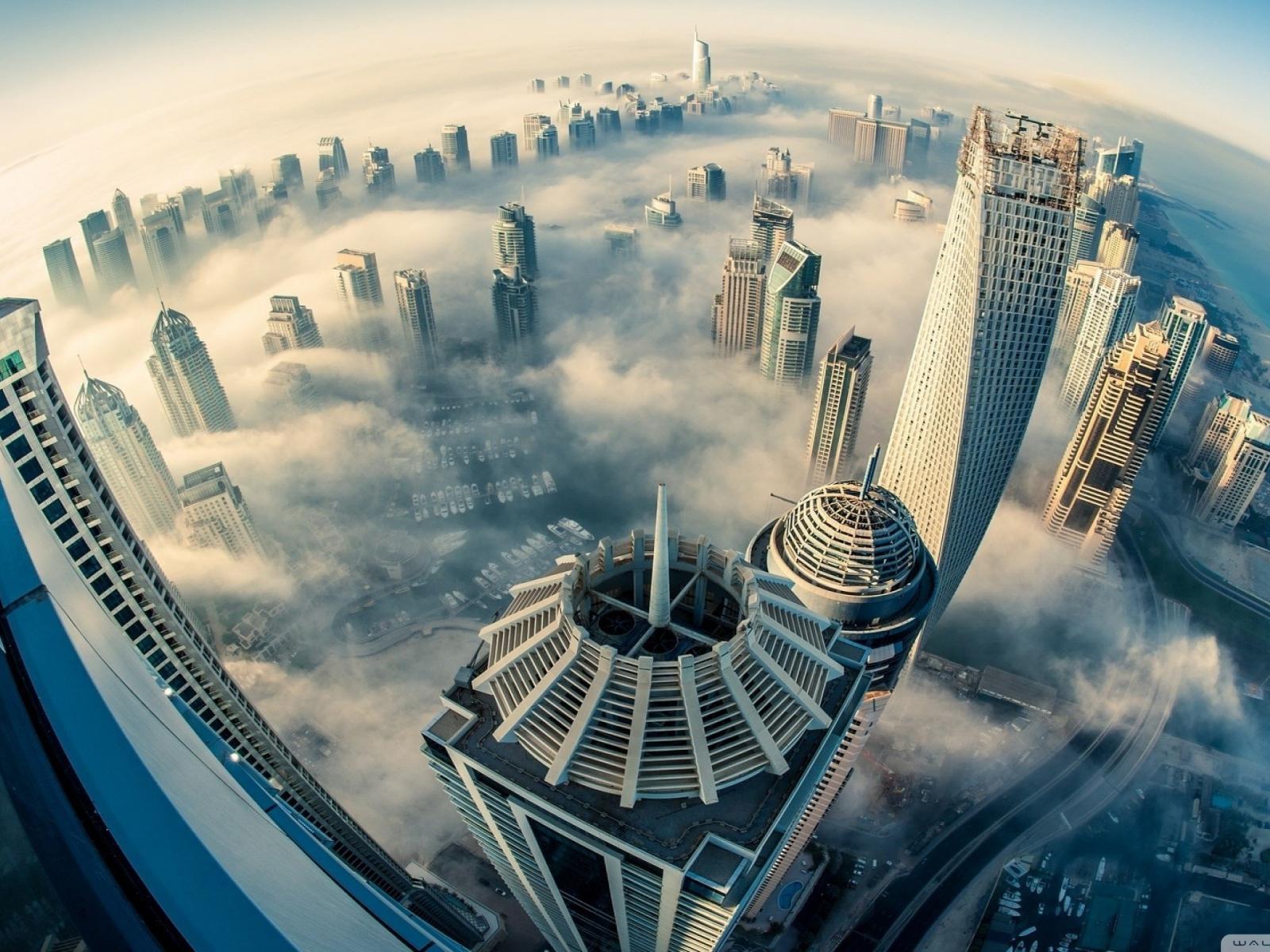 Wallpaper Panorama of foggy city, photo through a fisheye lens