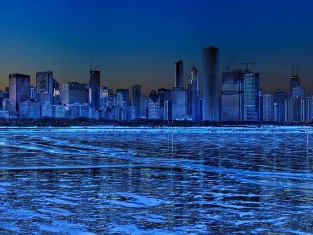Wallpaper Blue neon ice lake against the background of the metropolis, HDR Photo