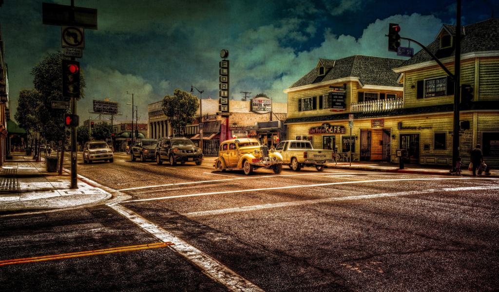 Wallpaper Cars at the traffic light in a small American town