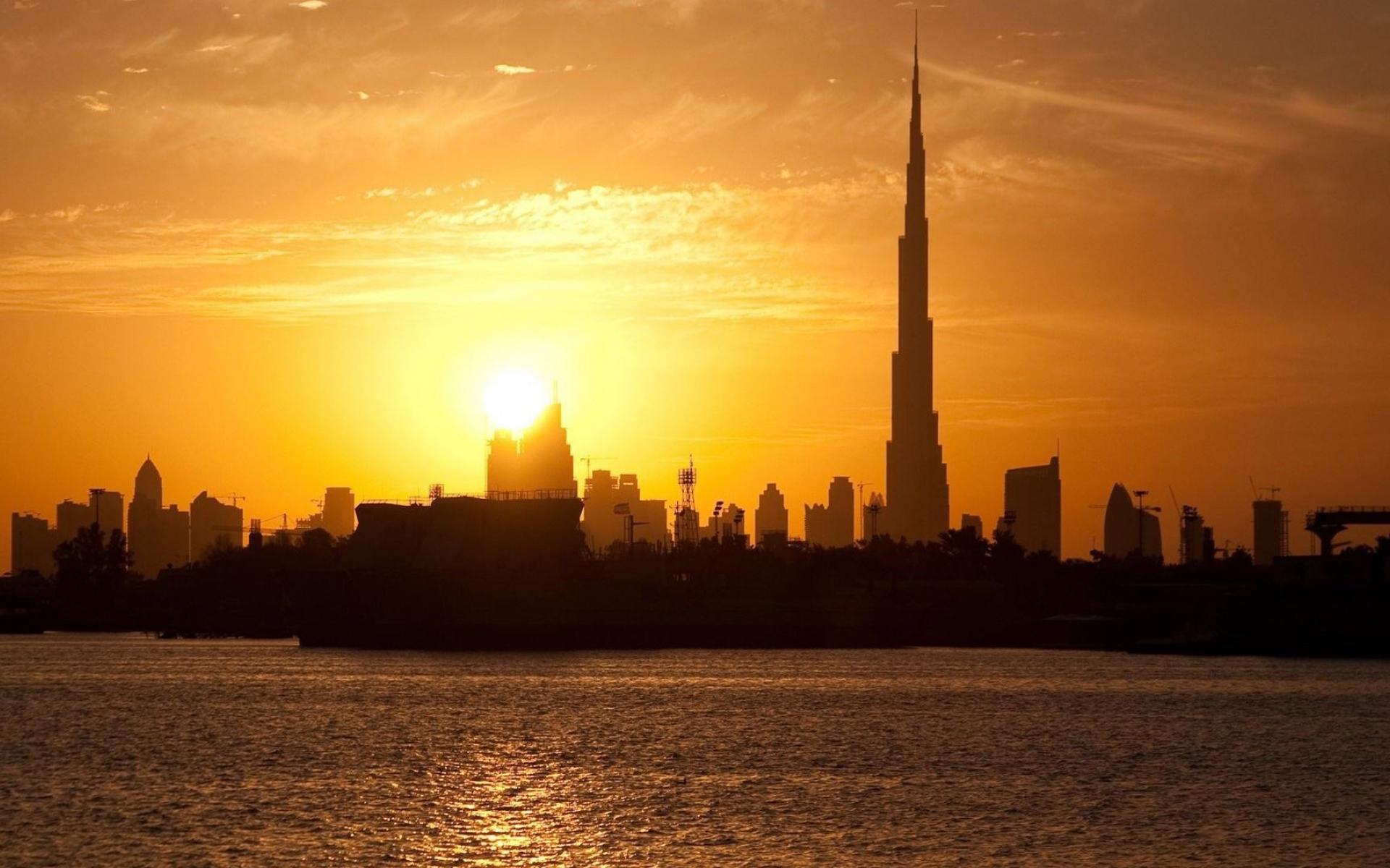 Wallpaper Silhouettes of the buildings of Dubai at sunset