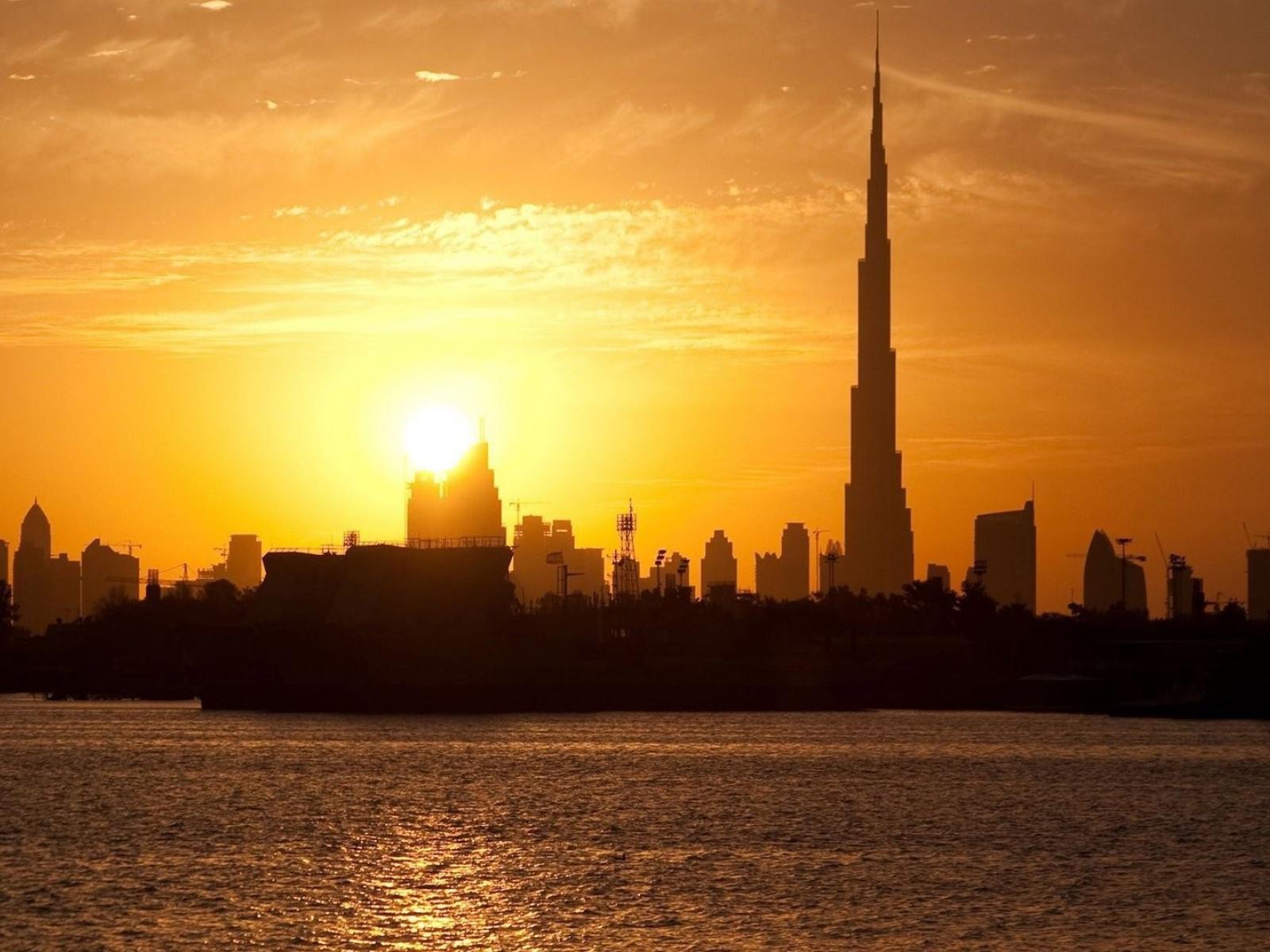 Wallpaper Silhouettes of the buildings of Dubai at sunset