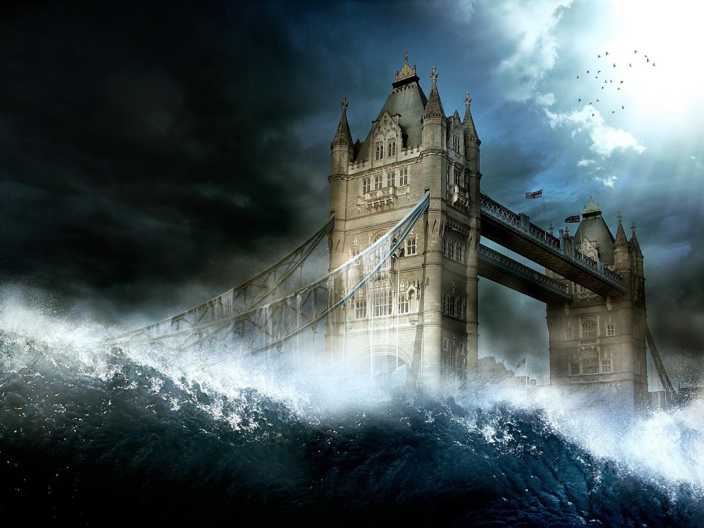 Wallpaper Tower Bridge is sinking in the waves during a storm
