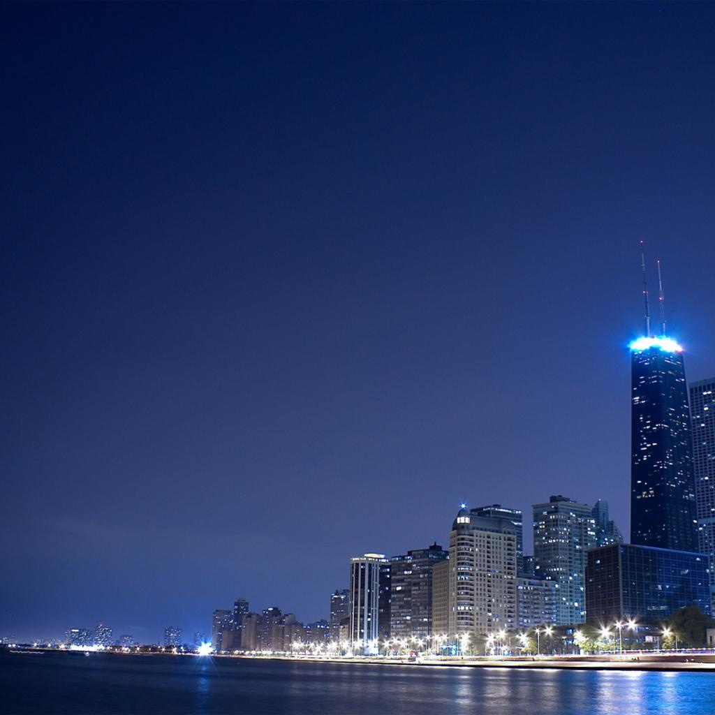 Wallpaper The lights of the city on the banks of the river in the evening