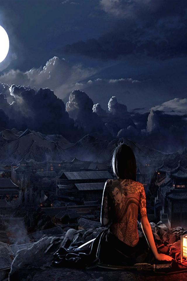 Wallpaper Japanese girl looks at the moon