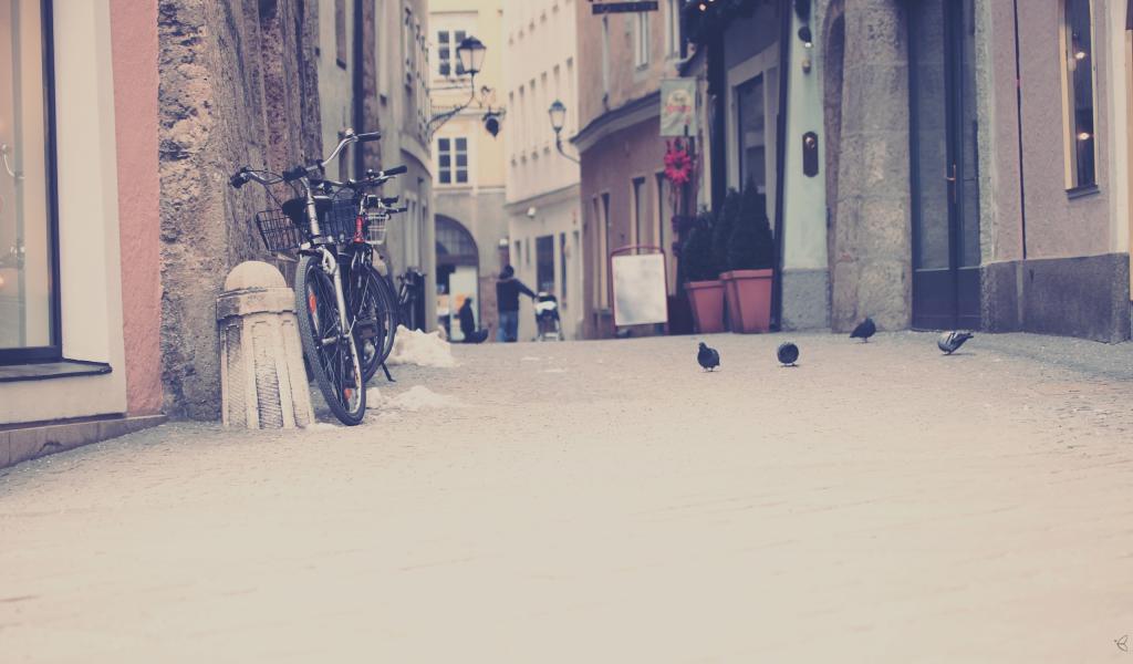 Wallpaper Old town, Bicycle, Pigeons
