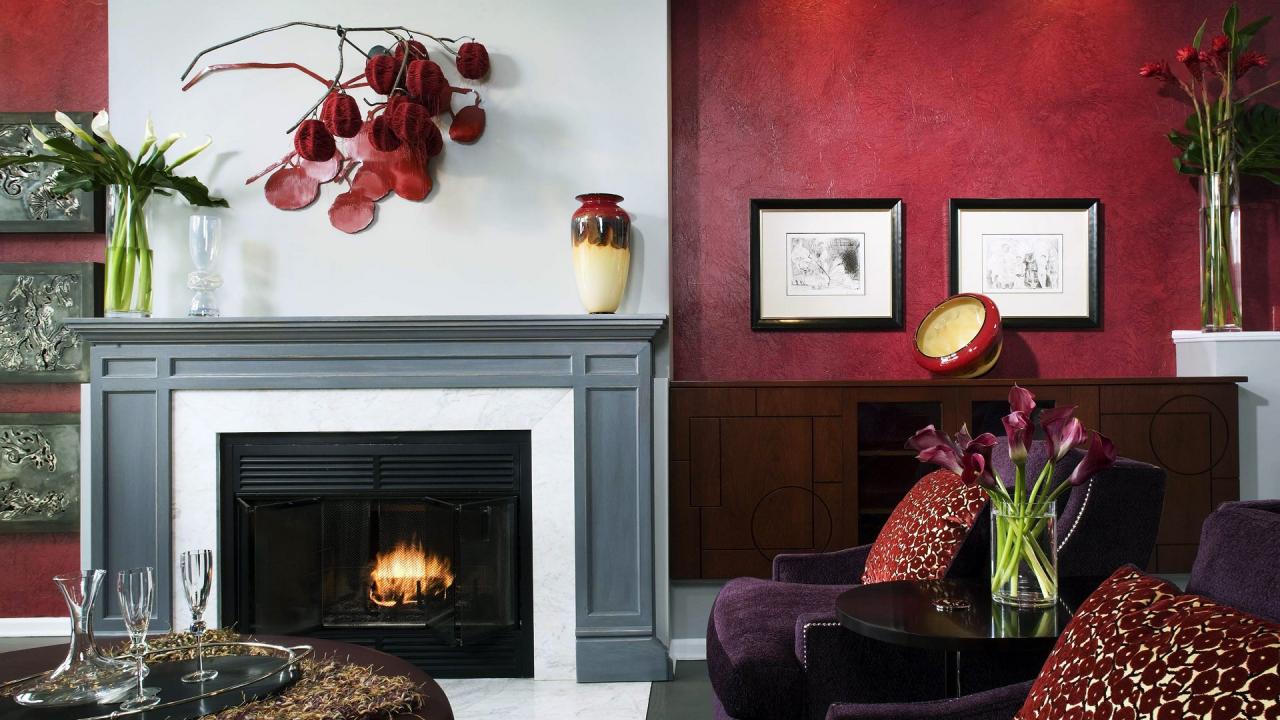 Wallpaper Living room with fireplace in red tones