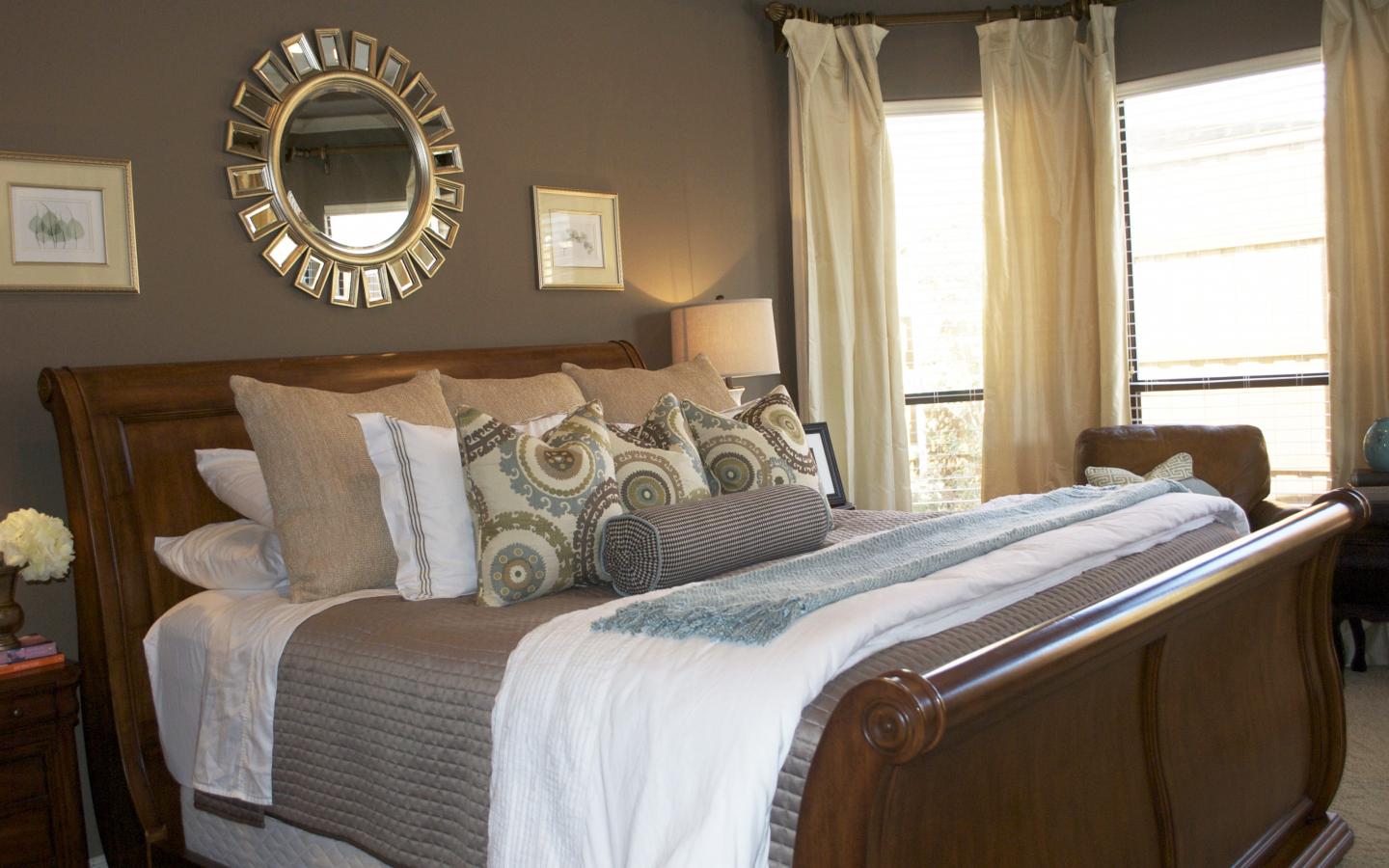 Wallpaper Round mirror over the bed in the bedroom