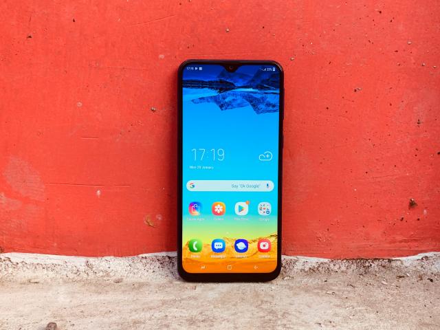 Wallpaper Smartphone Samsung Galaxy M20 on the red wall