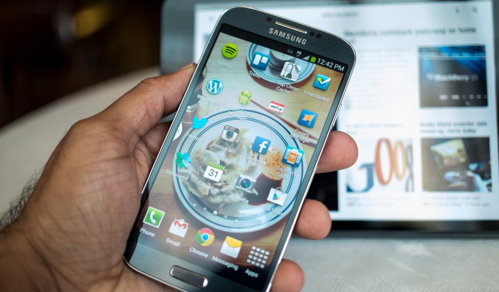 Wallpaper New Samsung Galaxy S4 on the background of tablet