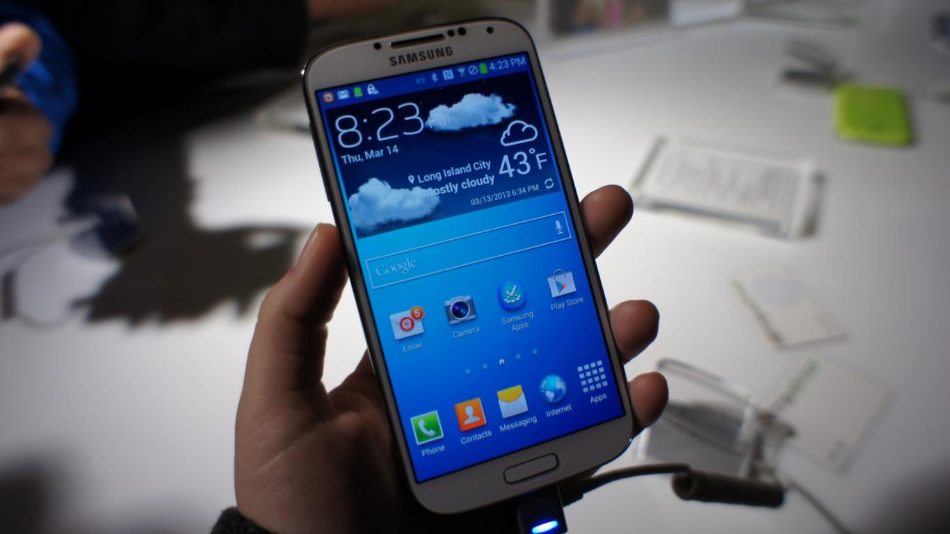 Wallpaper Samsung Galaxy S4 in hand on gray background