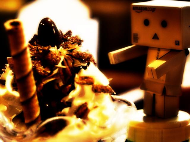 Wallpaper Cardboard man looks at a cake