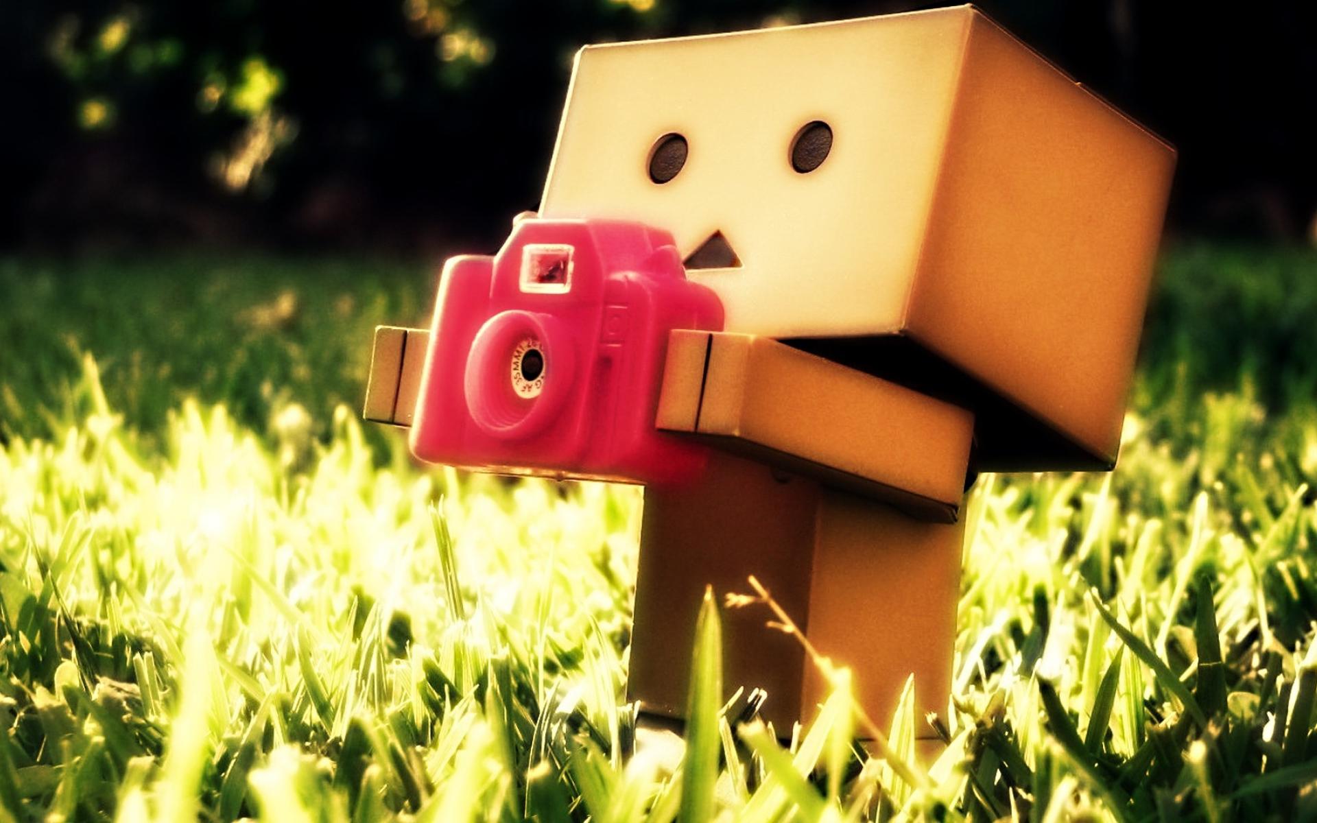 Wallpaper The cardboard man with a camera in the grass