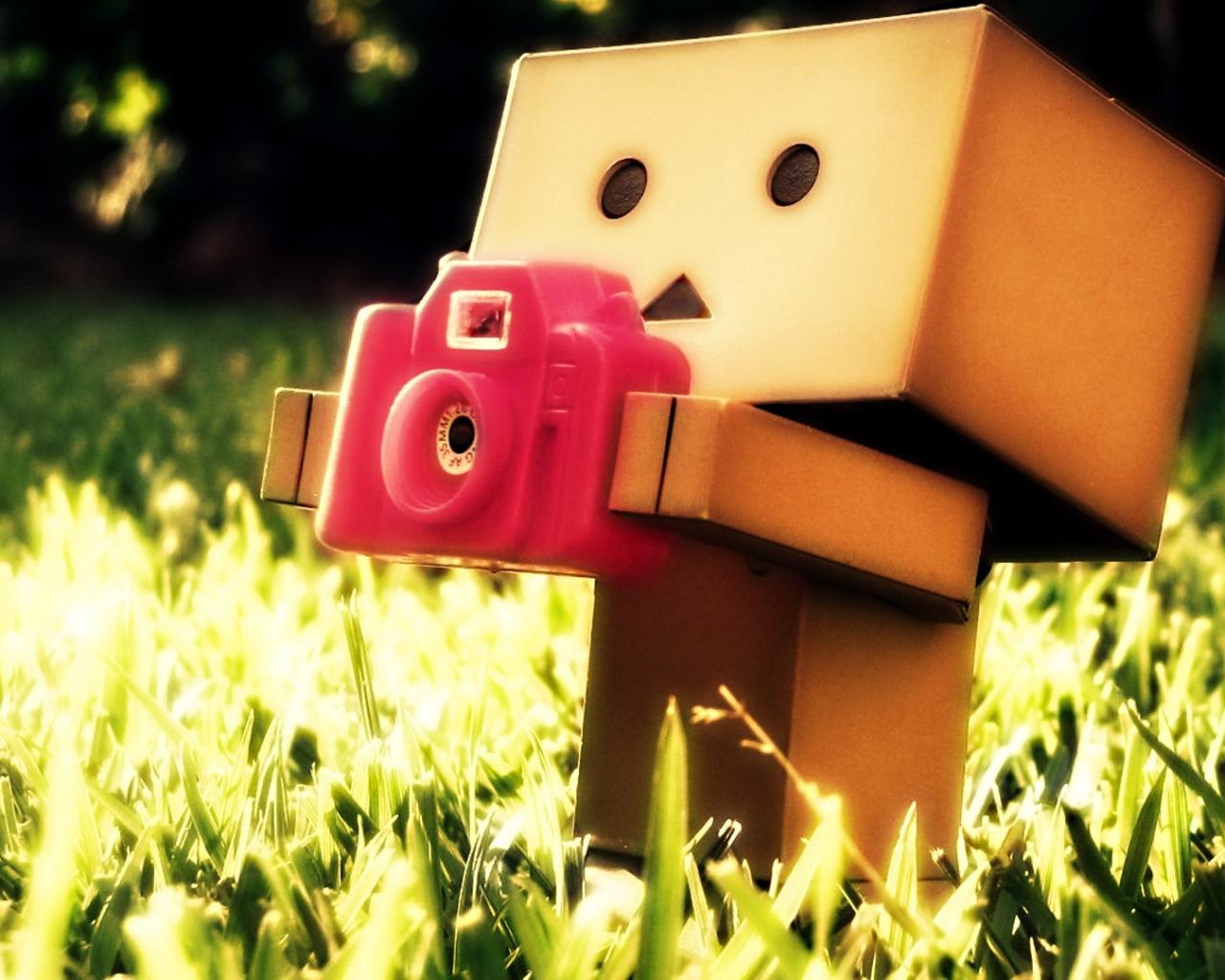 Wallpaper The cardboard man with a camera in the grass