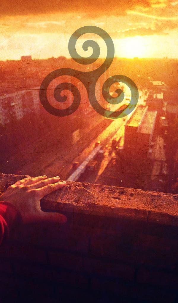 Wallpaper The symbol of the sun against the backdrop of the city