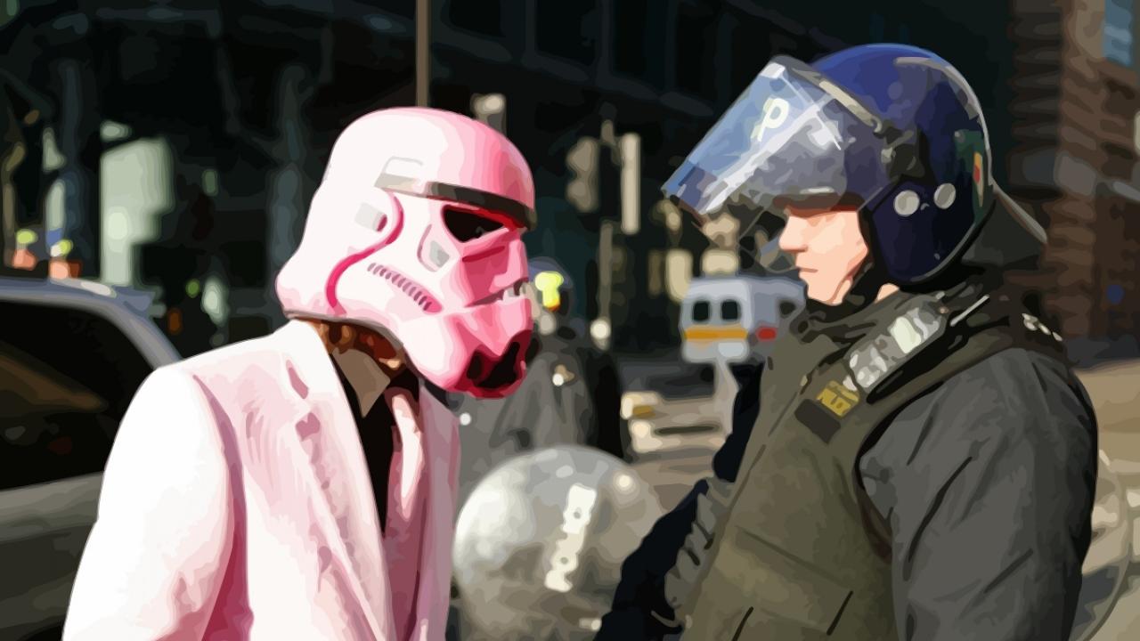 Wallpaper A police officer and a man in a pink mask of Darth Vader