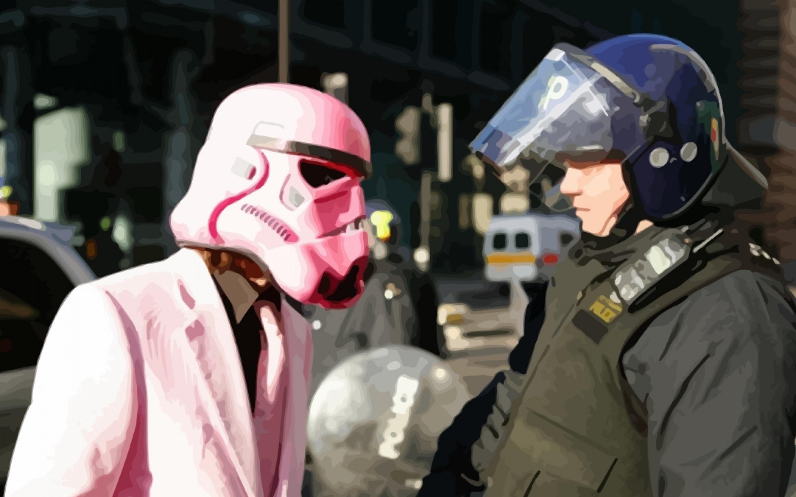 Wallpaper A police officer and a man in a pink mask of Darth Vader
