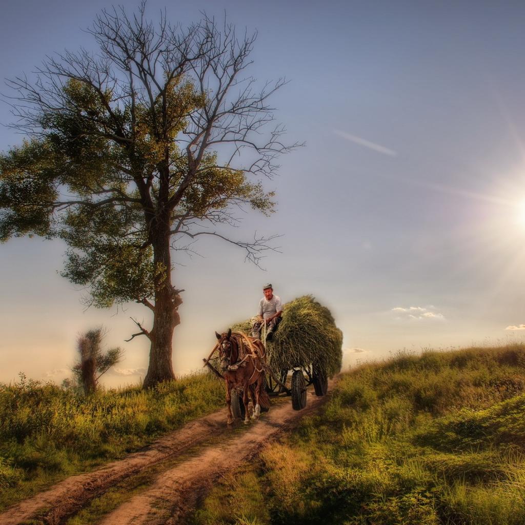 Wallpaper The farmer carries hay on the wagon