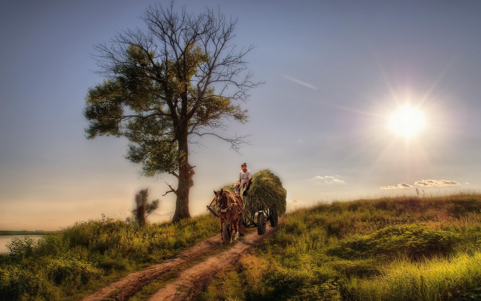 Wallpaper The farmer carries hay on the wagon