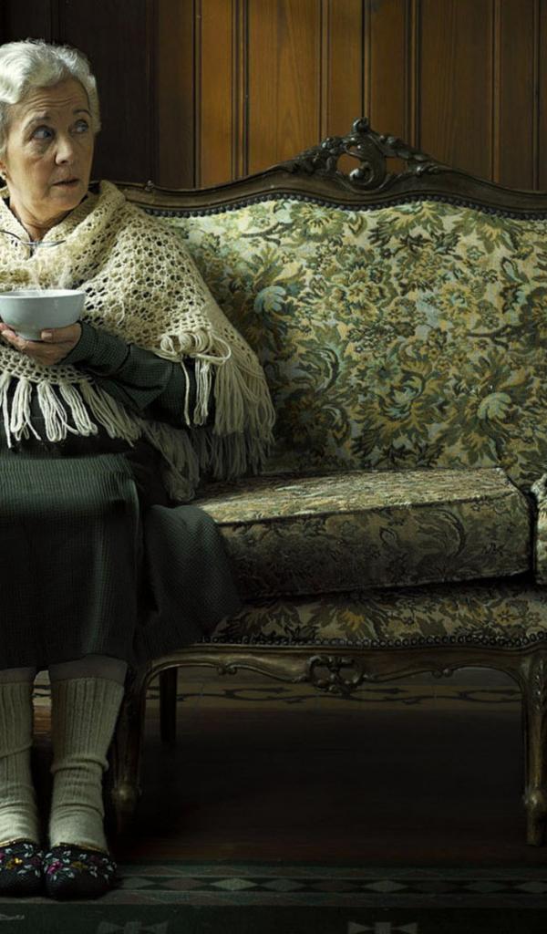 Wallpaper An elderly woman eating soup and looking at a penguin