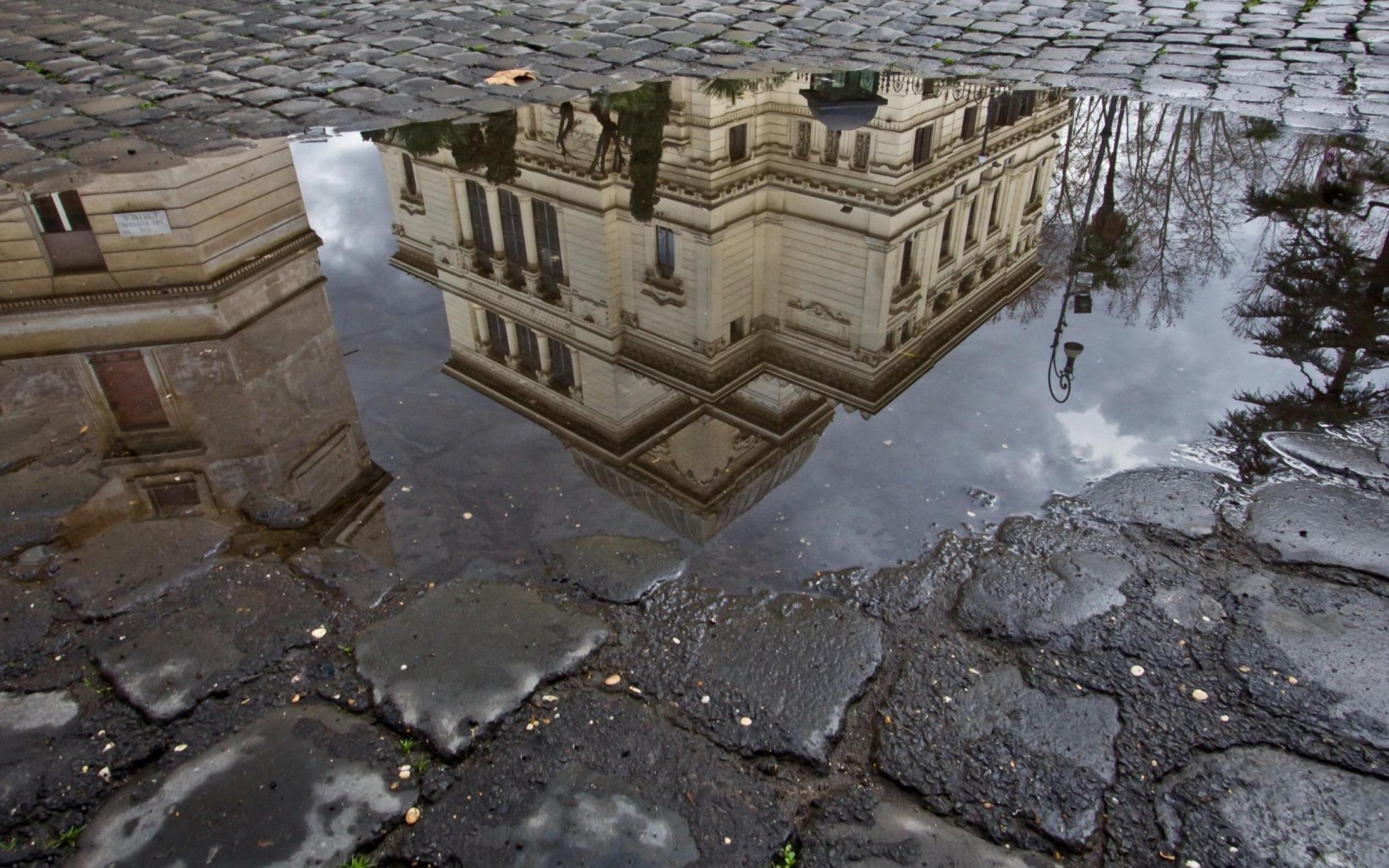Wallpaper Reflection of urban building in a puddle